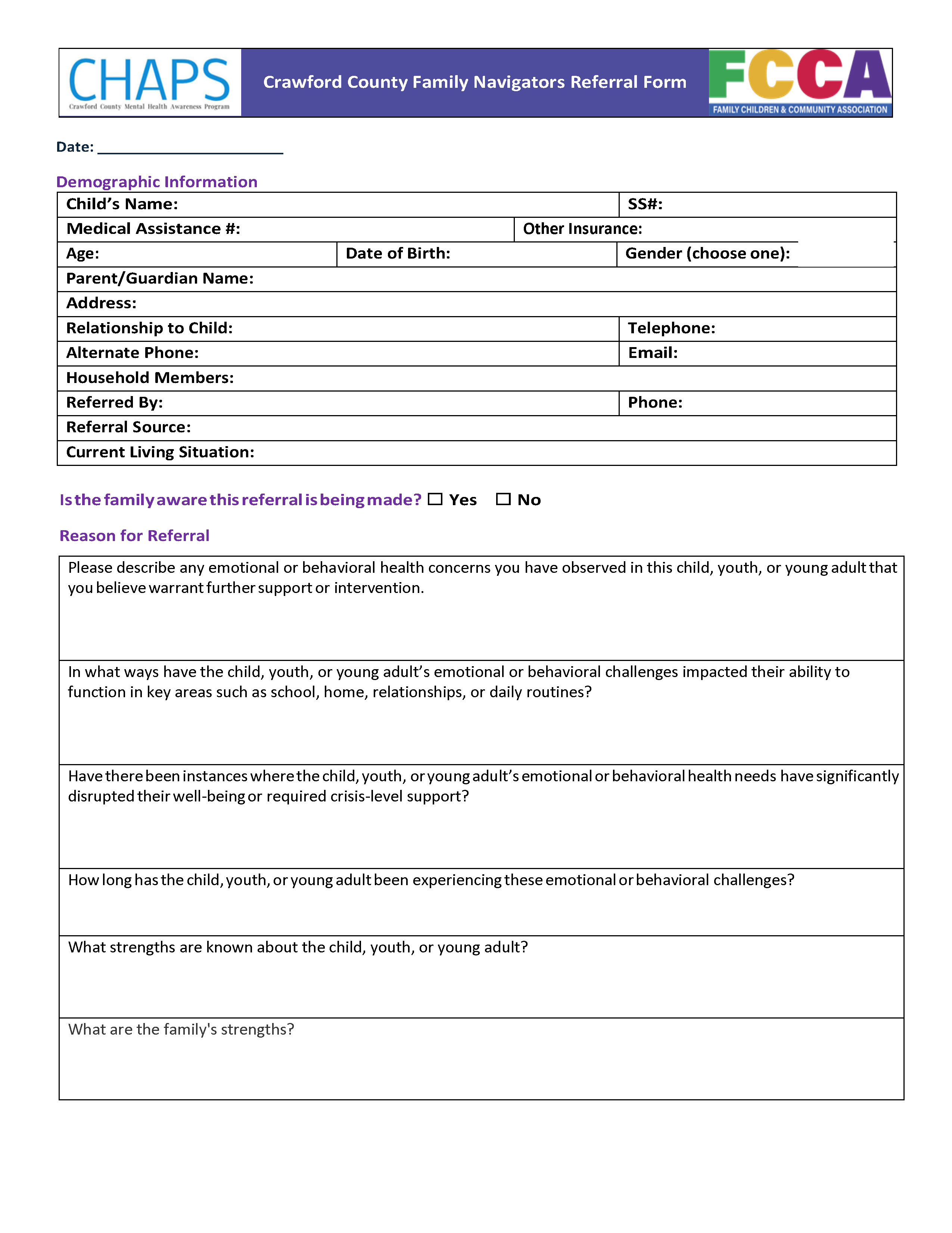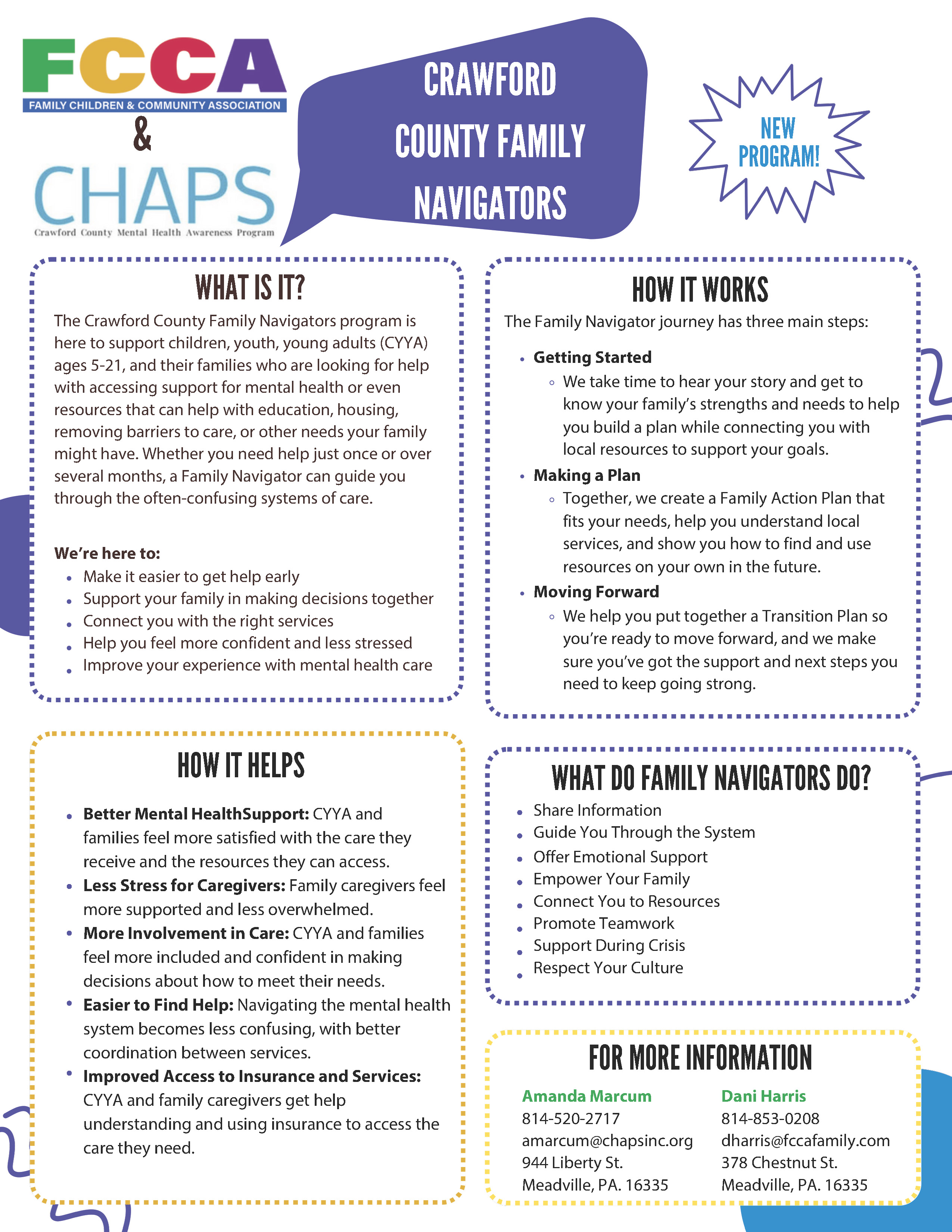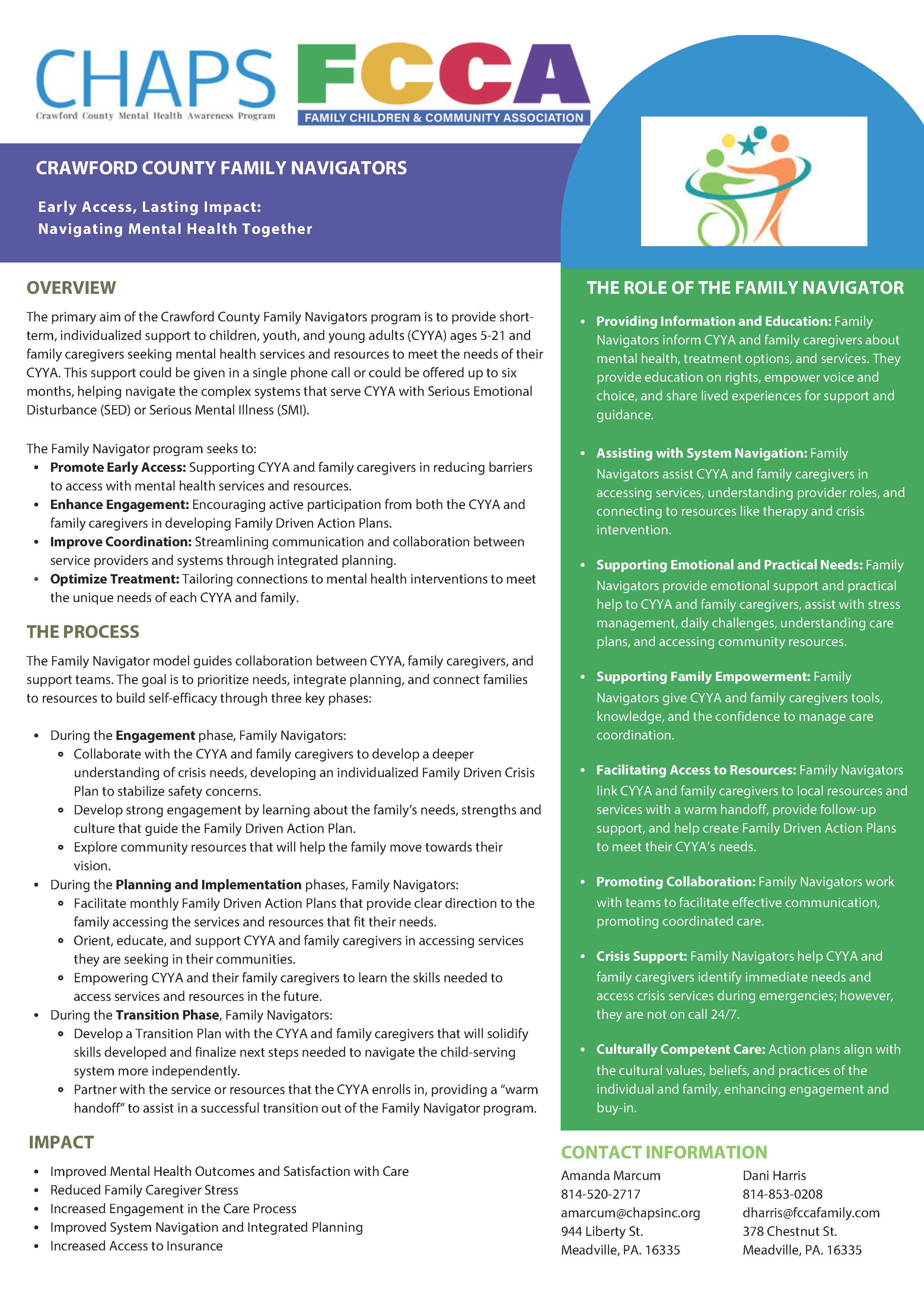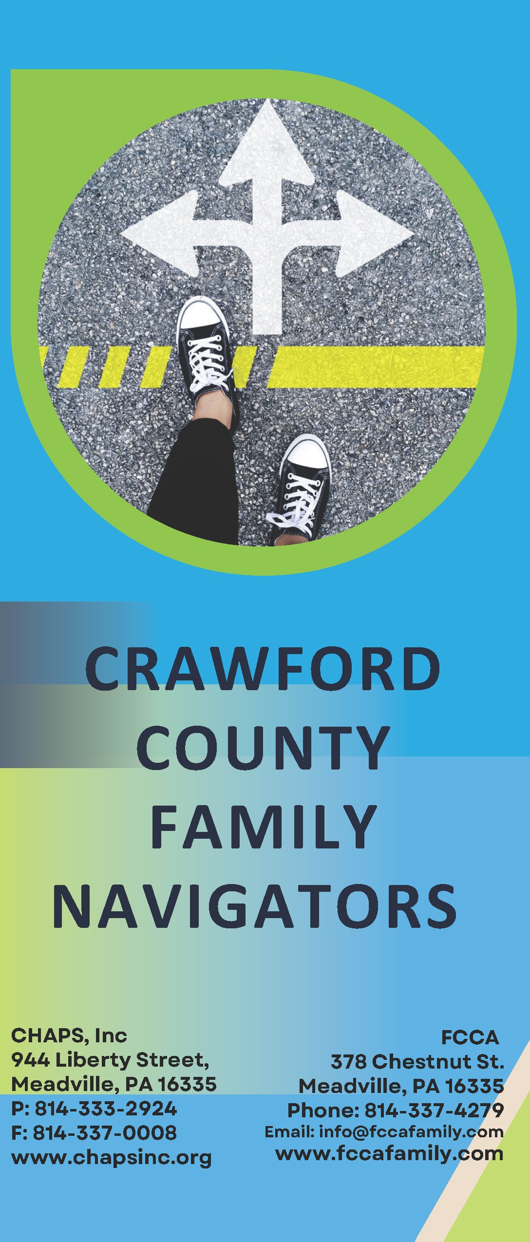 The primary aim of the Crawford County Family Navigators program is to provide short term, individualized support to children, youth, and young adults (CYYA) ages 5-21 and family caregivers seeking mental health services and resources to meet the needs of their CYYA. This support could be given in a single phone call or could be offered up to six months, helping navigate the complex systems that serve CYYA with Serious Emotional Disturbance (SED) or Serious Mental Illness (SMI).